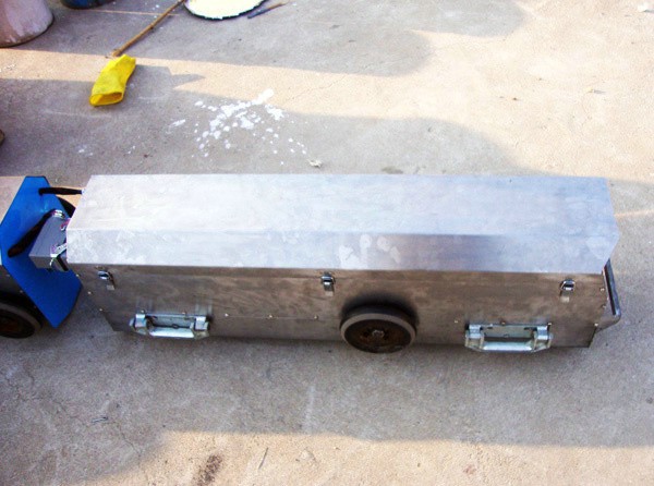 400補口機屬于空心工件內表面噴涂液體及預處理設備。由驅動、行走、除銹、吸塵、噴涂、監控和電源七部分組成。機體為三節,用鉸軸球頭組件聯接成一體。后部有行走電機驅動主動輪,五對從動輪安裝在中部和前部。除銹部分由一個電機帶動旋轉架旋轉,旋轉架上安裝三個小電機帶動鋼刷旋轉除銹。用吸塵器吸收銹塵。噴涂電機帶動旋杯高速旋轉,把液體涂料甩噴到焊口區域。能在直徑700~1000毫米管道內深達1公里以上自進自出。用無線遙控和視頻圖像直觀,完成焊口定位、除銹、吸塵、噴涂全過程焊口補口作業。自動化程度和工效高,補口質量好,為國內管道施工提供了一種機、電、訊一體化自主創新設備,具有推廣應用價值。